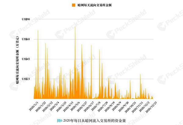 值得注意的是,暗網中的比特幣只有一小部分會直接流向交易所,但通過中間地址轉入交易所的這部分未被統計在內。
