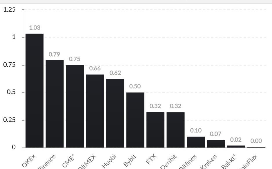 上圖反映了芝加哥商品交易所比特幣期貨未平倉量位列第三,超過了許多加密貨幣交易所。如果機構投資者希望積極參與比特幣期貨市場,那么CME將是它們的交易渠道。這樣,有理由相信CME未平倉量的增長是由機構推動的。