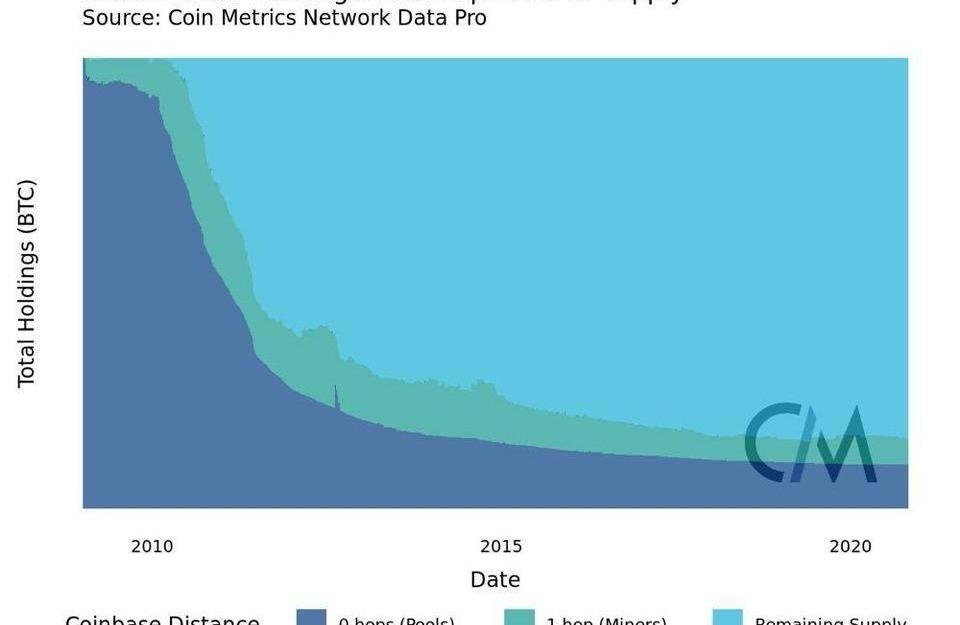 由于通脹原因,從總供應量的角度來看,礦工和礦池所擁有供應量逐漸減少的意義甚至更大。這種下降與比特幣供應分散度總體增加的趨勢是一致的。這也與礦池模式的普及趨勢相一致,這一趨勢意味著非挖礦地址越來越不可能被過多標記為1-hop地址。