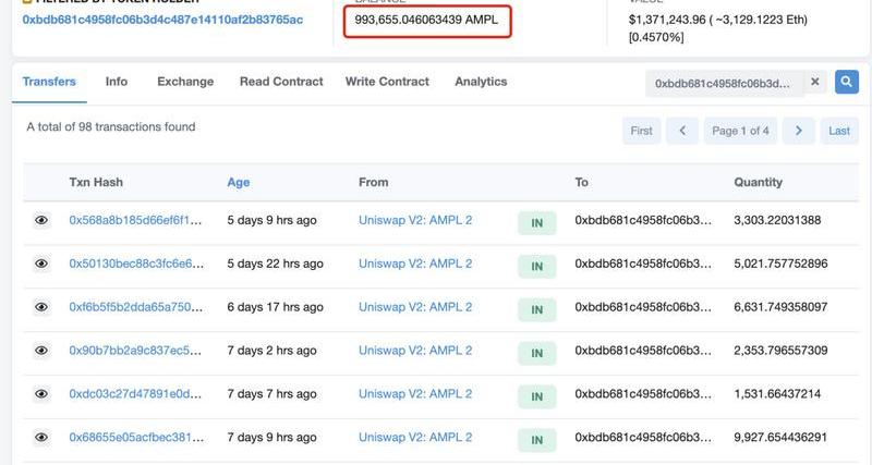 我挨個翻了一下AMPL持幣量排名前50的地址,發現有7個地址,都是從uniswap上AMPL/ETH池子里面買入的AMPL。