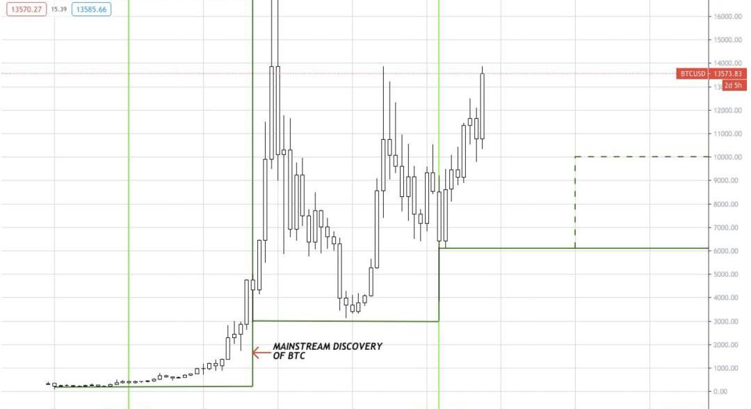 這將看到BTC回調至12000美元,再逐步增長。或者BTC將遵循曲線路徑,與2017年和2018年類似。如果后者發生,那么BTC將擊穿兩個向上的阻力位,大幅上漲。在此番上漲之后,BTC可能會出現2017年和2018年類似的大幅回調。