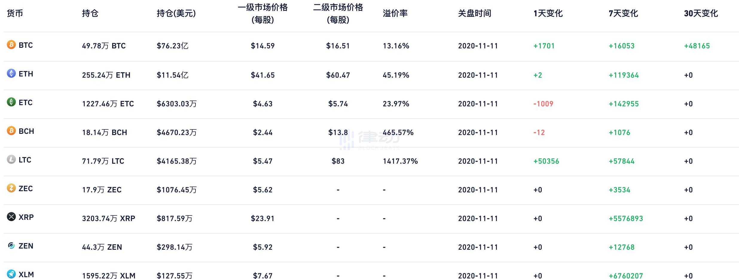 根據灰度官方于11月11日披露數據顯示,其比特幣信托持倉價值76.22億美元,以太坊信托持倉價值11.43億美元。昨日灰度比特幣信托持倉新增1701枚BTC,以太坊信托新增1枚ETH,除此之外,灰度還增持了50357枚LTC。目前,灰度總持有BTC497765枚,占總量的2.37%;總持有ETH2552434枚;總持有BCH181396枚;總持有LTC717922枚;總持有XRP32037384枚;總持有XLM15952238枚;總持有ETC12274640枚;總持有ZEC179021枚;總持有ZEN443002枚。