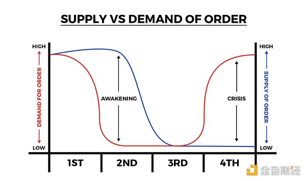 ?Brandon Quittem在“比特幣和第四次轉折”文章中展現了兩個不同步的正弦波形,一個代表著秩序的維持,另一個代表著對秩序的需求。