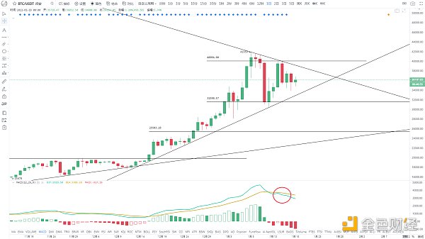 周線級別,收線還未突破站上39300美金,后續新的拉升趨勢還需醞釀,目前日線也是一個三角形收斂,今日支撐點位上移至33000美金,明日33400美金,每天400美金的速率上移,不破短線就可耐心持有,上方壓制線就是41950美金回落趨勢線,今日壓制位39000美金,明日下移至38800美金,每天200美金的速率下滑,日線突破站穩該壓制線,近期弱勢行情才會得到反轉,后續才有望挑戰前高41900一帶壓力,目前日線MACD指標線依舊是死叉發散的狀態,近期直接走強突破的概率不大,后面大概率還將延續一段時間的整理走勢,周線收線不破31800美金,中長線繼續持有,短線不破三角支撐線,持有為主,前期20000美金一帶的壓制也是經過了3周多的寬幅震蕩,最終形成突破,目前4萬美金一帶的壓力也需要震蕩消耗,大方向多頭趨勢未變。