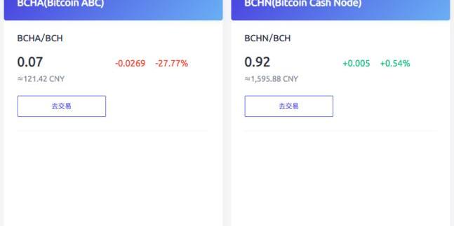 另一家交易所CoinEx則提前提供了兩種分叉幣的期貨交易業務。在CoinEx上,持有BCH的用戶,已經可提前兌換分叉幣,1BCH可兌換為1BCHA和1BCHN,CoinEX為兩個分叉幣提供了交易市場。根據11月1日的數據,BCHA暫報0.07BCH,BCHN報價為0.92BCH,價格上遠遠領先BCHA。