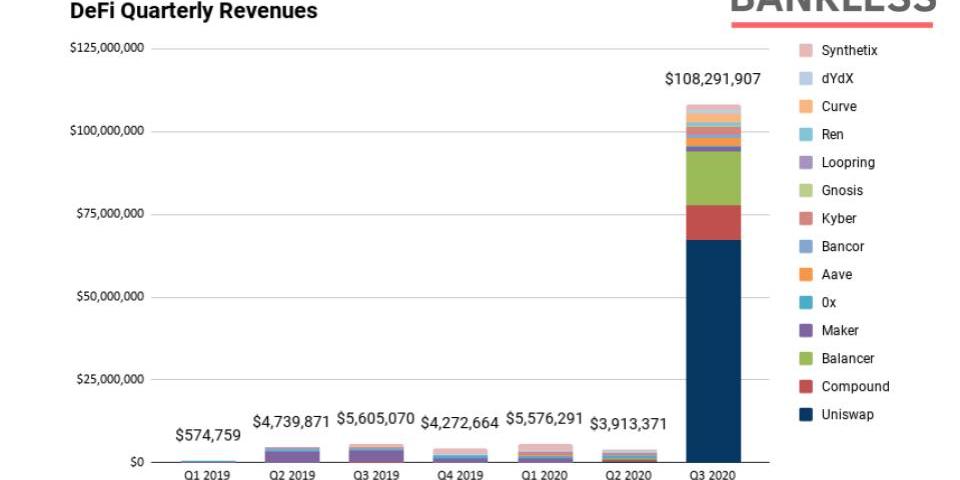可以肯定的說,在第三季度,DeFi迎來了自己的時刻。在2020年第三季度,DeFi協議的總收入超過了1.08億美元,自2019年以來環比增長18倍,相比上個季度則增長26倍。