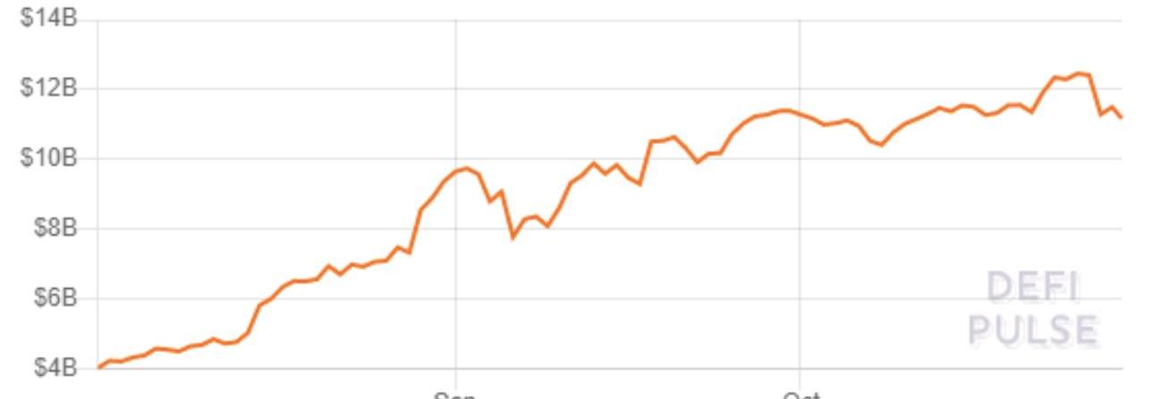 盡管DeFi資產出現大幅回調,交易量減少,但已鎖定的總價值仍接近歷史高位。DeFiPulse數據顯示,目前鎖定的總價值為112億美元,較10月25日的歷史高點124.6億美元略有下降。