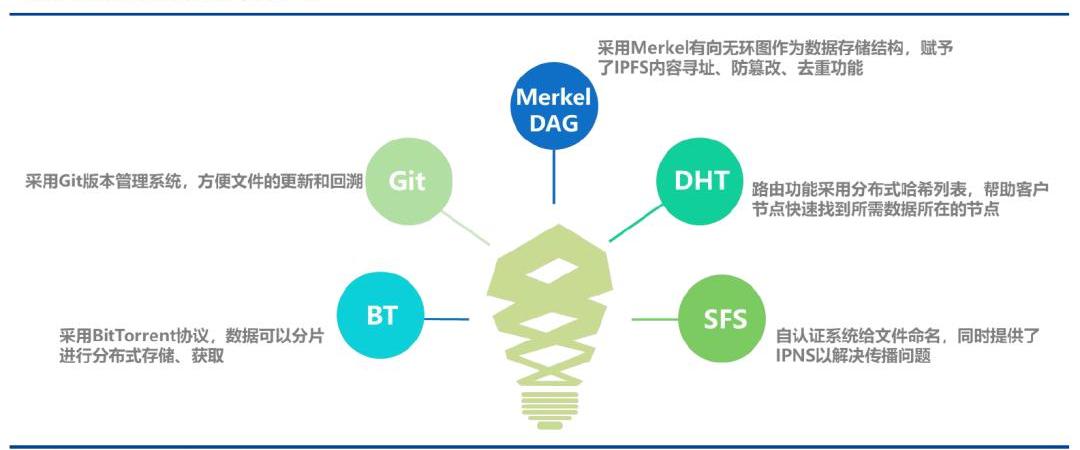 與現有Web協議不同的是,對于一個存放在IPFS網絡的文件資源,不是用基于域名的地址去訪問,而是通過基于文件內容生成的唯一編碼去訪問,不需要驗證發送者的身份,只需要驗證內容的哈希,可以讓網頁的速度更快、更安全。IPFS的網絡上運行著一條區塊鏈,即用來存儲互聯網文件的哈希值表,每次有網絡訪問,即要在鏈上查詢該內容的地址。IPFS協議最大的特色是系統的耦合及設計的綜合性,其整合的分布式技術包括BitTorrent協議、版本控制系統Git、MerkelDAG、分布式哈希表DHT和自認證文件系統SFS。因此在IPFS系統中,人人都可以作為存儲文件的服務器。
