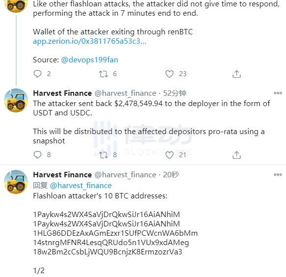 目前HarvestFinance官方仍在對此事進行調查。Harvest團隊表示,除了套現的BTC地址外,社區中流傳著大量關于攻擊者的信息,將懸賞10萬美元尋找攻擊者。此次懸賞僅僅是出于對平臺用戶資金的考慮,希望攻擊者能將資金打回開發者地址,團隊尊敬攻擊者的技巧和聰明才智,不會對攻擊者有其他方面的干擾。?