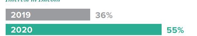 GrayscaleInvestment調研發現,人們對比特幣的興趣正在上升。2020年,有超過一半美國投資者對比特幣感興趣。2019年,有36%的受訪者表示對比特幣投資產品感興趣,而今年這一數字有了顯著增長,達到55%。