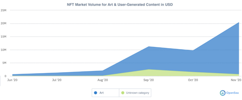 光是 2020 年下半年,藝術品 NFT 以及用戶創作內容的交易量就從每個月 100 萬美元增長到超過 2000 萬美元。6 個月時間,20 倍的增長!