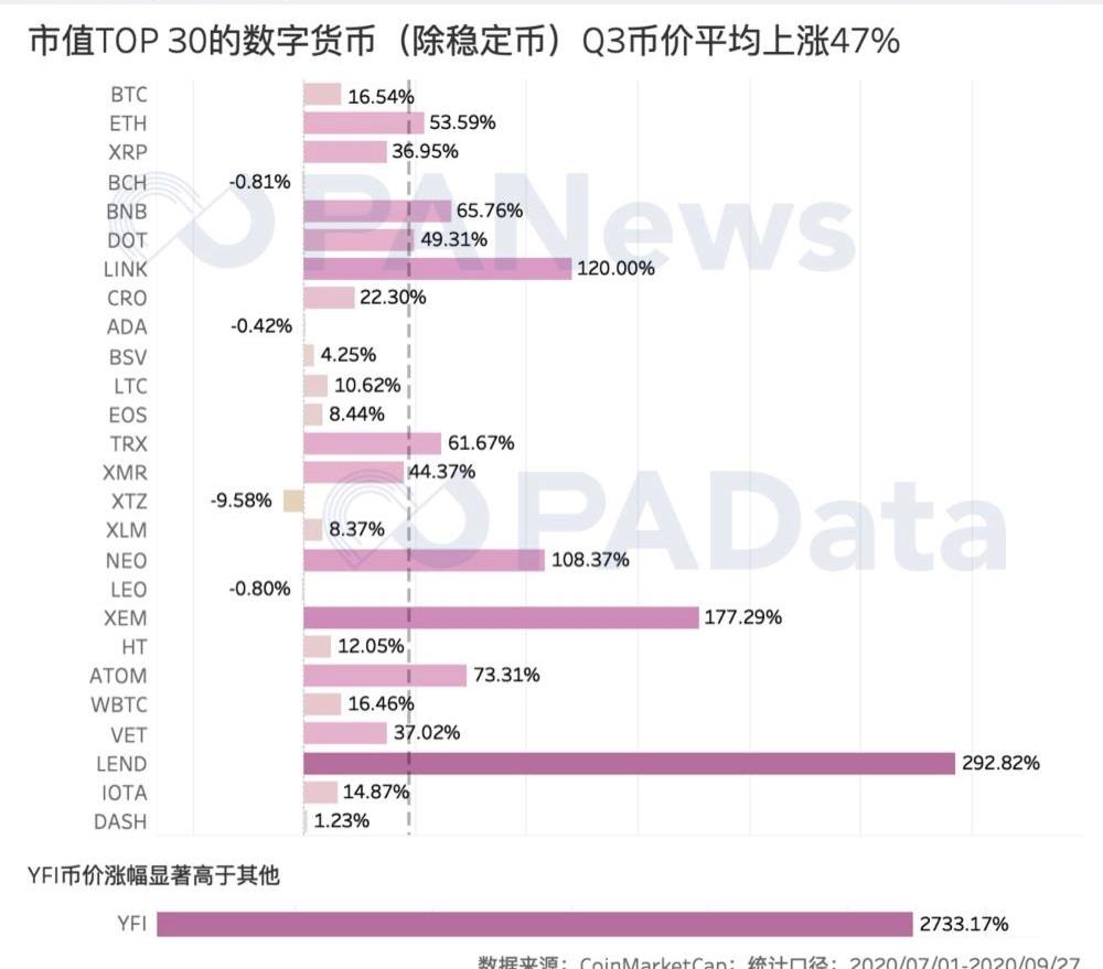 為展現在狂熱的“農耕時代”中,各個數字貨幣的具體表現和市場新動向,PAData進行了本年度第三次TOP30系列觀察(TOP30指市值排名前30的數字貨幣,下文簡稱TOP30),觀察期為7月1日至9月27日。根據分析,三季度TOP30的幣價平均上漲超47%,季度持幣收益區間同比擴大46%,但總市值略有下滑,幣價日均波動率已回升至7%以上,需警惕風險。YFI成三季度收益表現最佳的資產。