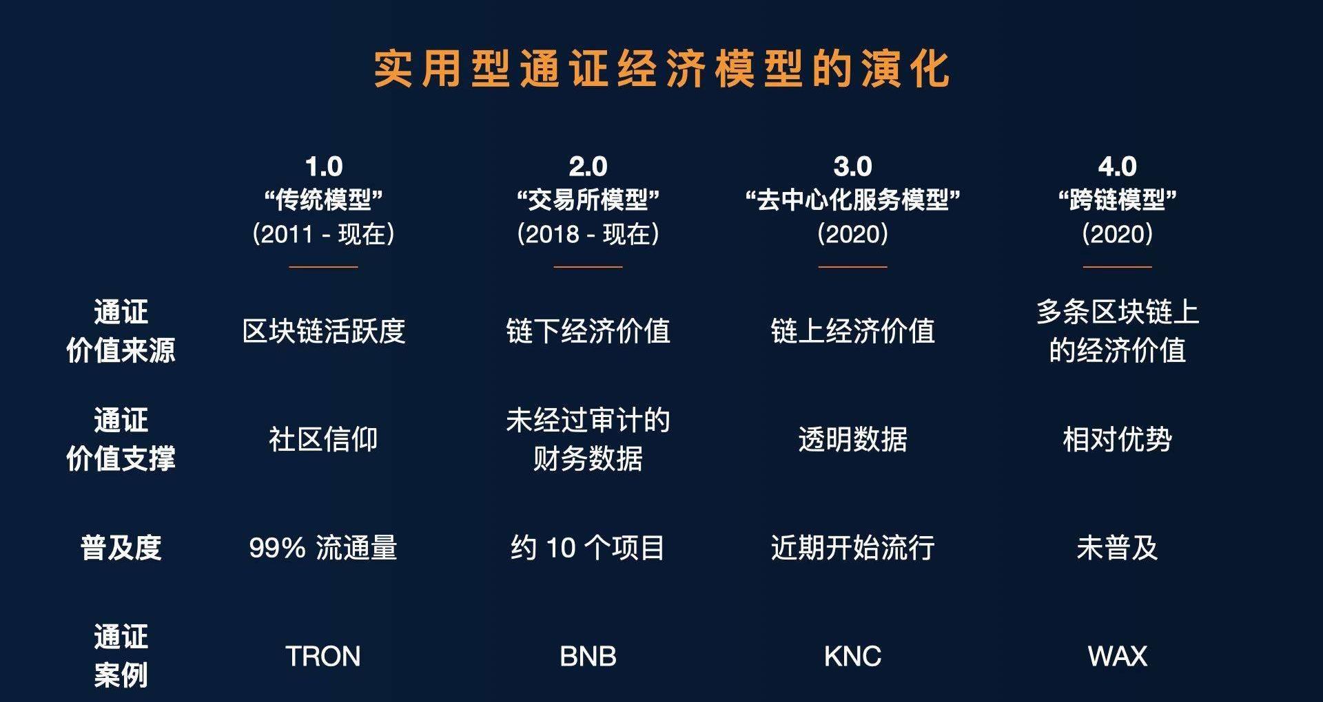 實用型通證經濟模型3.0:所謂“去中心化服務模型”,出現于2020年,通證價值直接來自鏈上活動,且公開透明,典型的通證案例:KNC。