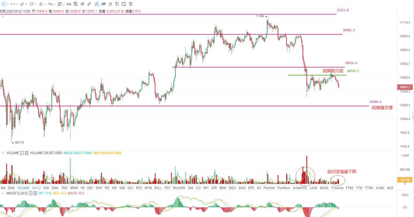 如圖所示,雖然現在價格在下跌,但是所對應的成交量相比前期有明顯萎縮,這種萎縮是呈現趨勢性的,突然間放大的概率比較小。于此同時從MACD指標來看,如果價格再創新低,那么極有可能形成底部背離。這兩種現象都反映出市場繼續大跌的內在動能是不足的,所以在發現幣價創新低時不要以為這是進一步走弱的表現而去追空,新低后迎來短期的“否極泰來”的概率較大,重點關注10200一線支撐。