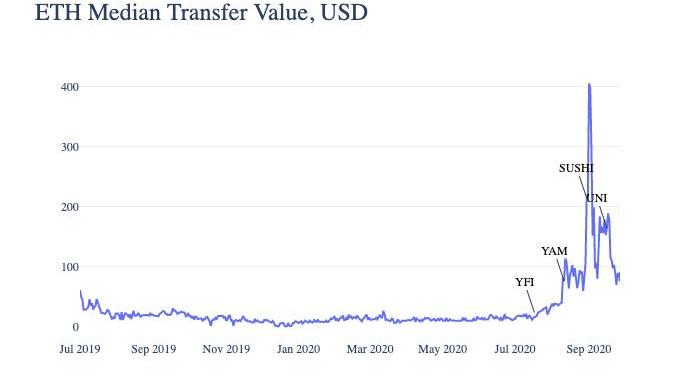 隨著YFI、YAM、SUSHI和UNI代幣上線,以太坊交易費的中位數暴漲。每當有新代幣上線,人們都會爭相搶奪這些代幣并在Uniswap等交易所上進行交易。由于Uniswap交易是在鏈上進行的,每一筆交易都必須支付交易費。用戶支付的費用越高,礦工優先打包該交易的可能性就越高,相應地交易確認的時間也就越快。為了盡快達成交易,用戶之間打起了交易價格戰。