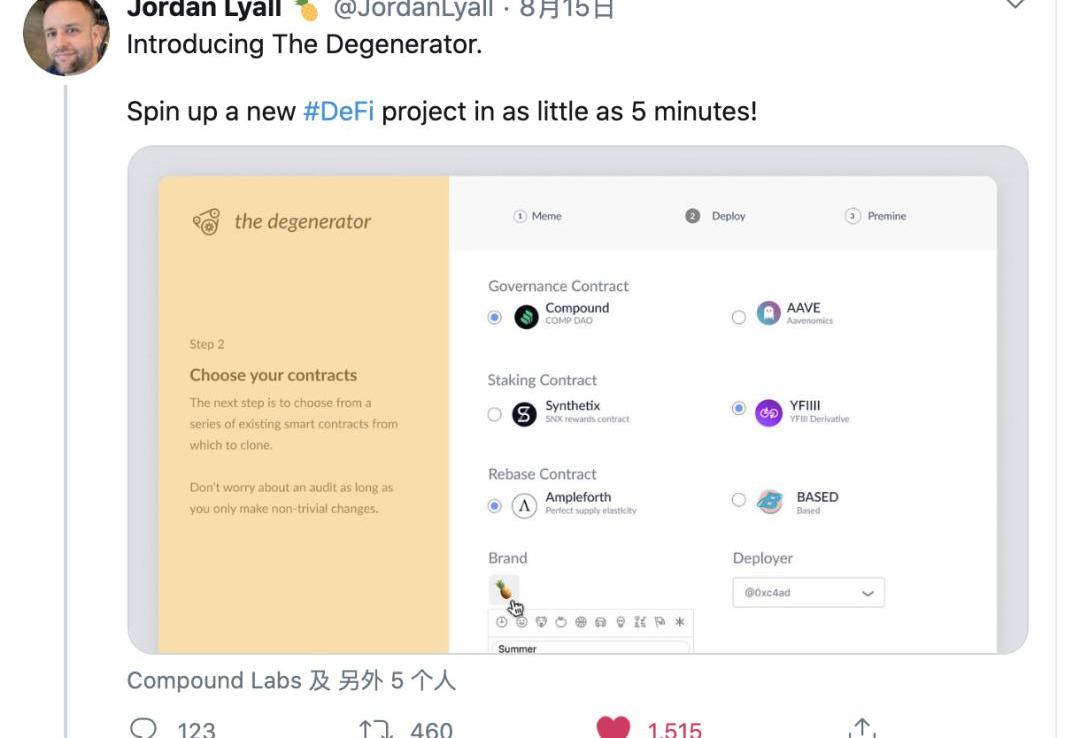 創始人JordanLyall是consenSys的defi產品負責人。最初是被各種類似于sushi、泡菜等meme項目惡心到了,認為大家被高APY驅動去挖空氣meme幣是可悲的。于是他在8月15日表示要啟動一個“TheDegenerator”虛構DeFi項目,目的只有一個:鄙視市場上短時間內就上線的DeFiMEME項目。