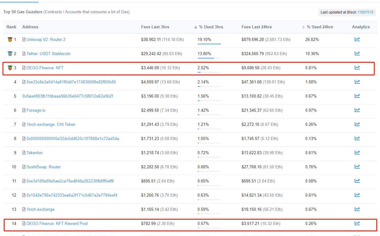 首次拍賣的天價開場,不僅得益于DEGO花樣的玩法,也源于近期DEGO項目的火熱,我們在以太坊鏈上數據和社交媒體的熱度中就可以看到,DEGO已經被推向了DeFi和NFT這兩個市場的風口浪尖。根據以太坊鏈上數據,DEGONFT在Gas消耗量上最高排名第2位,目前排名第3位,僅次于Uniswap和USDT。