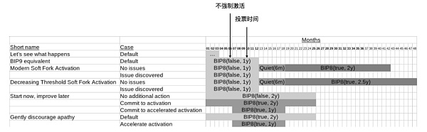 激活提案的種類還是挺多的,不過從目前已經投票的情況來看,很多都傾向于 BIP8 (false,1y)的這個方式,也就是這個軟分叉并不會強制激活,有 1 年的投票區間,如果投票通過閾值,就會激活。