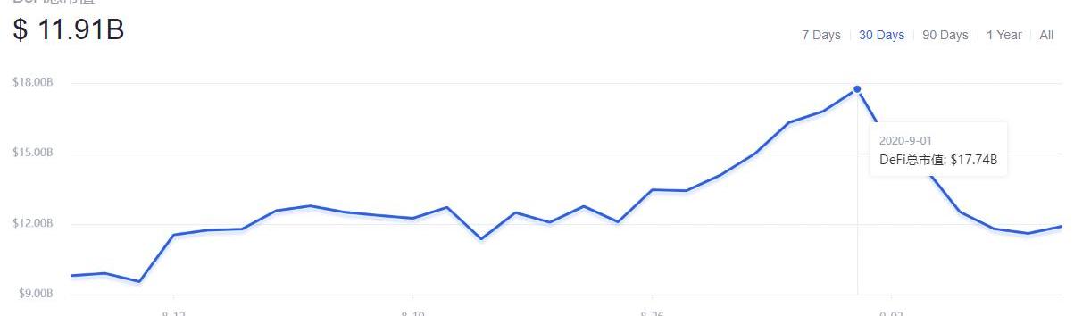 鏈上鎖倉資金從10億美金增長至約90億美金。與之相關,在主流加密貨幣行情波動較小的情況下,DeFi相關的加密貨幣市值卻迎來一輪暴漲。