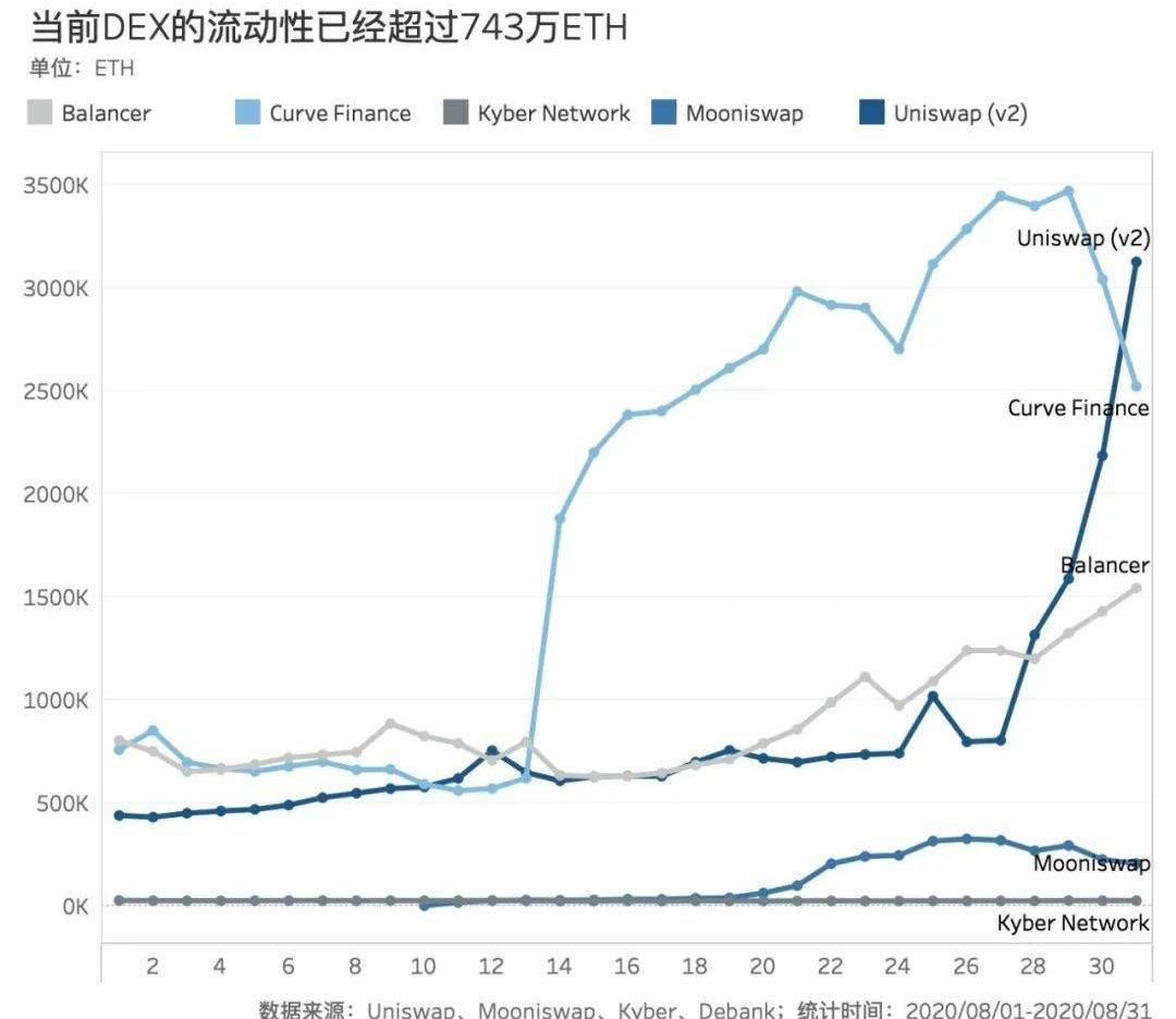 根據統計,截至8月31日,Uniswapv2、Curve、Balancer、Mooniswap和Kyber的流動性總量約為743.10萬枚ETH,相當于32.41億美元。