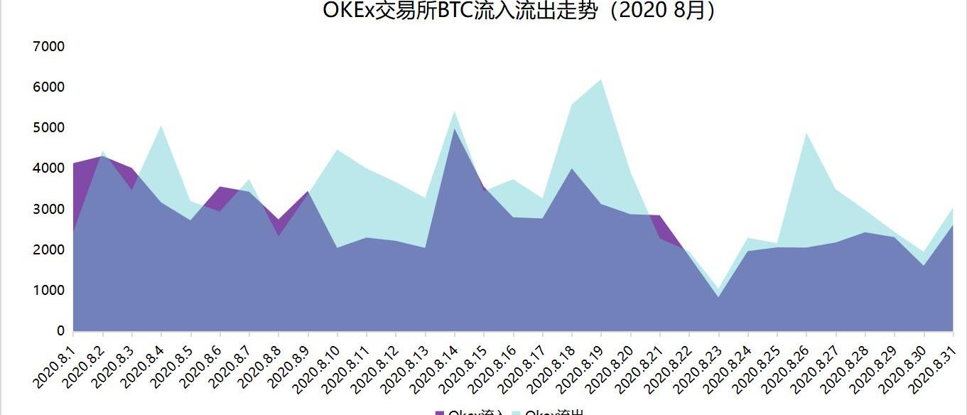 最后看看OKEx,該所在2020年8月份流入87134.16BTC,比上月下降24.50%;與此同時流出106620.51BTC,比上月上漲12.30%;月凈流入-19486.35BTC,比上月下降195.23%,鏈上各項數據降幅明顯,從7月的強勢凈流入轉為8月的凈流出。
