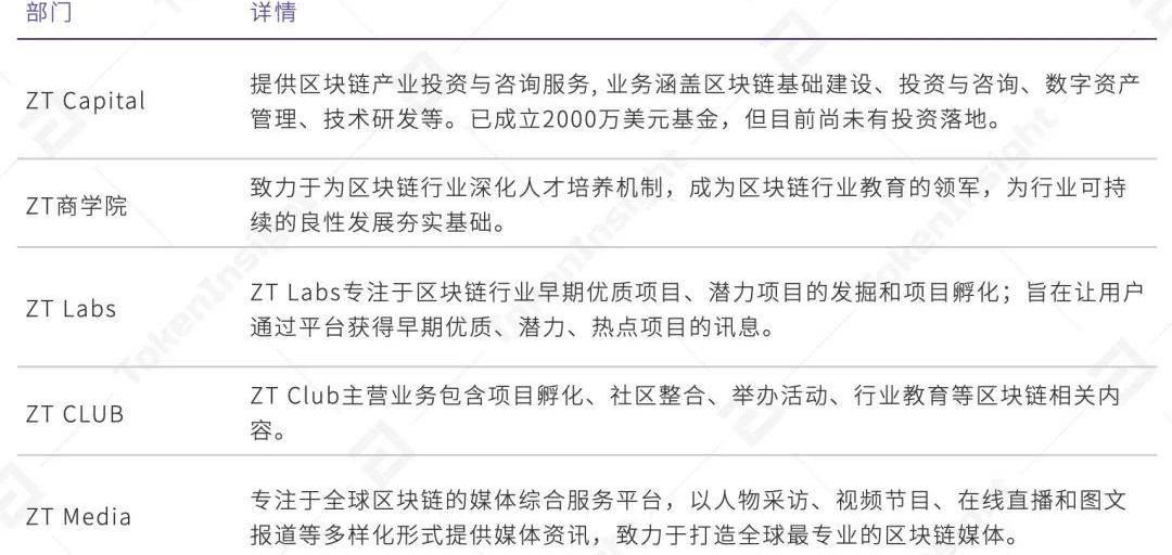 產品方面沒有全面鋪開,但在其他方面,ZT交易所盡可能在自身范圍內覆蓋對行業的發展進行支持。在內部,ZT成立了ZTCapital和ZTLabs等多個部門,包含了對區塊鏈行業和項目的研究和市場教育等方面。ZT內部生態建設的主要目的是為了全面地跟蹤市場,支持外部生態布局。目前,據ZT披露,其對DeFi、波卡、存儲類領域均有布局,例如,平臺已上線DOT等波卡生態項目,并將于近期開放波卡和存儲類專區和上線數個波卡生態項目。部門具體情況如下表所示。