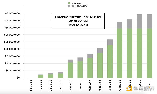 2020年第四季度,灰度比特幣信托之外的灰度產品的需求增長至4.364億美元,比上一季度增長35%,比19年第四季度增長近1300%。 增長的很大一部分是由于持續流入灰度級以太坊信托(3.418億美元),使灰度比特幣信托之外的灰度產品的2020年流入達到了10億美元。