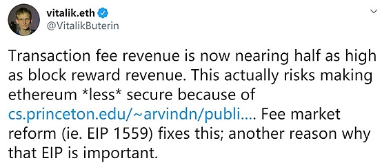 V神就曾專門針對手續費用不斷飆升的現狀發推,稱交易費用的持續高企可能威脅以太坊的安全性,同時強調“EIP 1559提案可解決這一問題”。