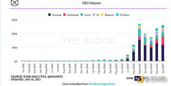 根據TheBlock匯編的數據,2021年1月當前的DEX交易量為260.1億美元,該月還有近半個月。2020年9月份,在DeFi熱潮的推動下,DEX交易額曾達到266億美元。Uniswap目前占1月份交易量的44.85%,SushiSwap為22.19%、Curve為12.98%。