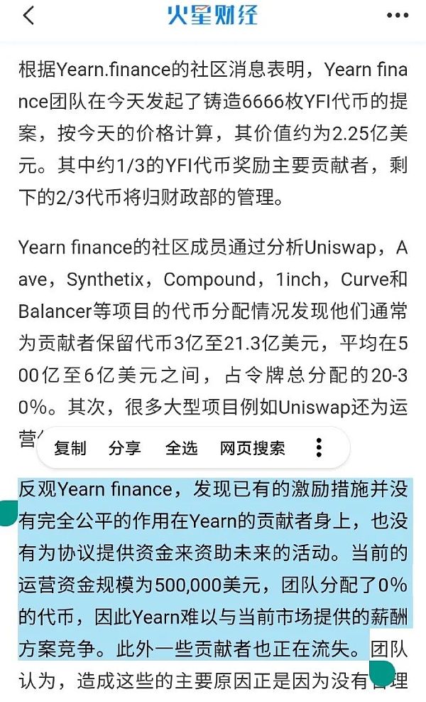 Yearn finance團隊在今天發起了鑄造6666枚YFI代幣的提案,按今天的價格計算,其價值約為2.25億美元。其中約1/3的YFI代幣獎勵主要貢獻者,剩下的2/3代幣將歸財政部的管理。Yearn finance的社區成員通過分析Uniswap,Aave,Synthetix,Compound,1inch,Curve和Balancer等項目的代幣分配情況發現他們通常為貢獻者保留代幣3億至21.3億美元,占令牌總分配的20-30%。其次,很多大型項目例如Uniswap還為運營保留了大量資金。