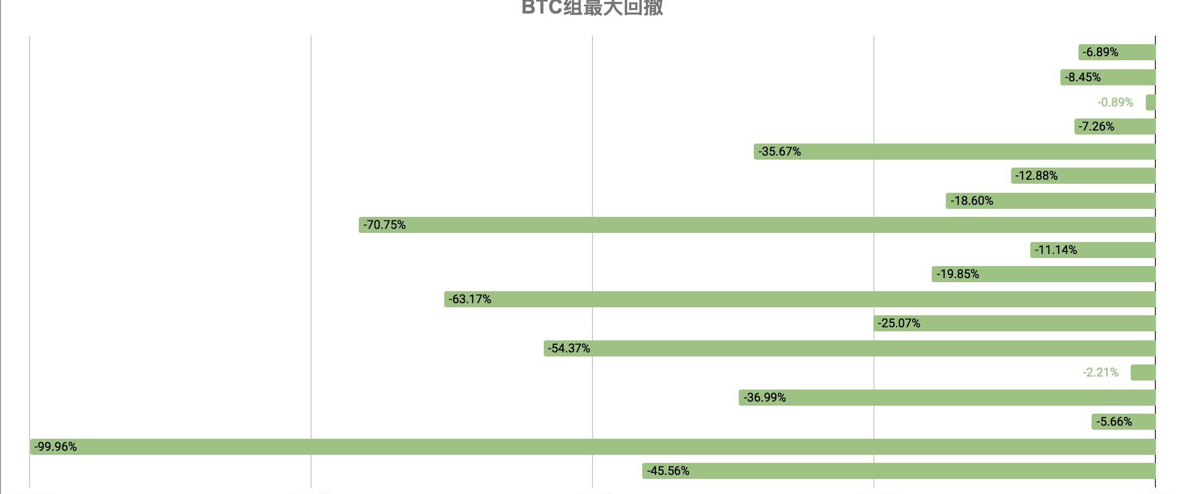 根據最大回撤數據顯示,個別量化受杠桿影響加之行情波動幅度較大,整體處于爆倉邊緣。