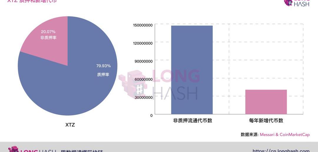 從以上數據中我們可以看到,作為市值排名第二的公鏈,ETH集中在持幣大戶中的比例最低,也就是去中心化程度最高。而Tezos的代幣XTZ在去中心化上也有著不錯的表現,至少比同樣后起之秀的Cosmos,Tezos的去中心化更勝一籌。目前Tezos與Cosmos二者的動態質押率都維持在較高的水平,但如果新產出的代幣沒有更好的共識價值支撐,會面臨較大的拋壓。增發代幣相對現有的非質押流通代幣量比例越高,越有可能對市場流通代幣造成沖擊。