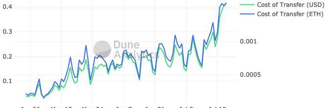 下圖展示了以太坊區塊鏈上ETH和美元的交易成本走勢情況,資料來源DuneAnalytics: