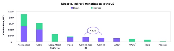 由于游戲內購買激增,游戲產業的創收端口正在從開發者轉向游戲玩家。事實上,隨著進入門檻降低,許多玩家成了開發者。我們認為,這種轉變提高了視頻游戲的變現率。未來五年,玩視頻游戲的每小時成本可能會增加20%,但相對于其他娛樂和信息渠道而言仍將有利可圖。