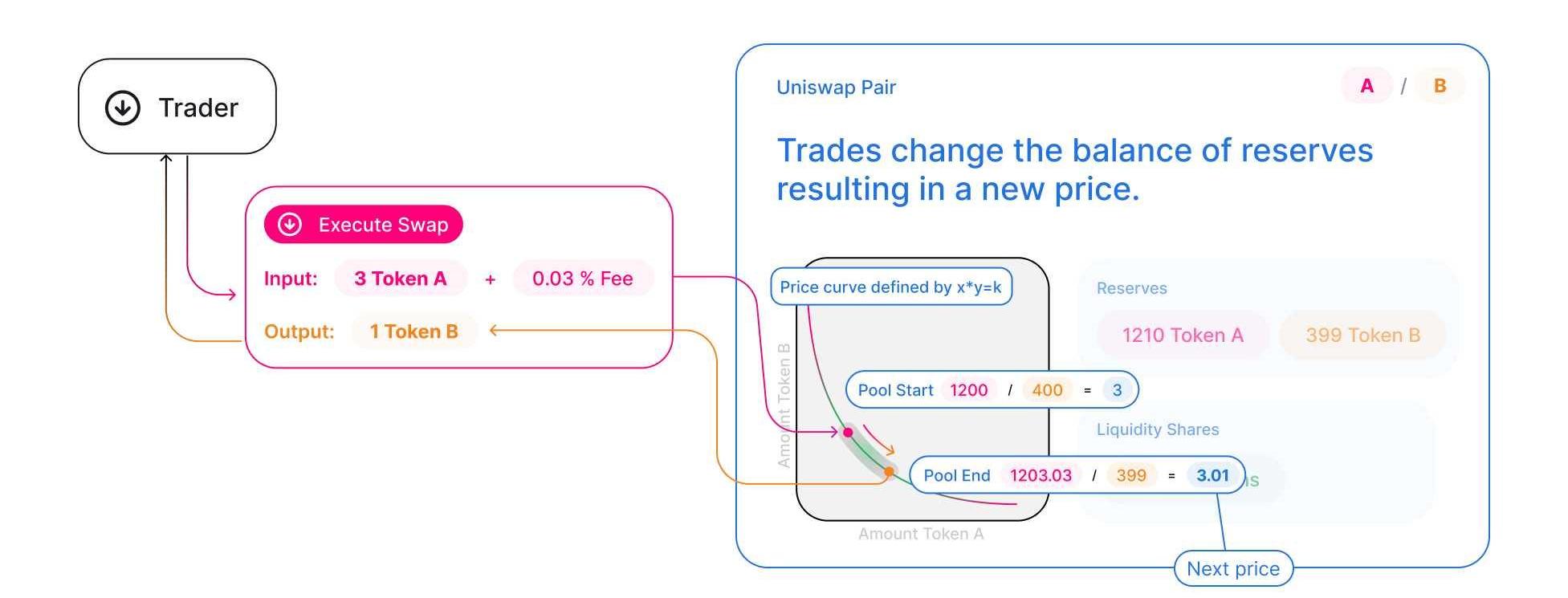 Uniswap最大的特點是自動化做市商,用既定算法代替人工報價。這里簡單介紹一下它的自動化做市商算法: