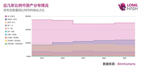 大多數比特幣地址(剛好超過 50% )在 2021 年有 0 到 0.001 BTC ,這與過去幾年的情況相差不大。按照今天的價格,0.001 BTC 大約是 38 美元。