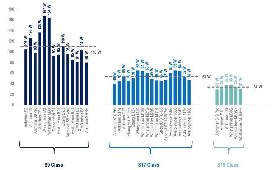 請注意,我們使用“S17類別”,“S9類別”和“S19類別”作為通用術語,以包括Bitmain設備以及具有類似規格的競爭設備。因為Bitmain的“S9級別”有很長的市場主導歷史,因此我們僅使用Bitmain型號來定義類別。在所有相關計算中,我們還假定PUE為1.12,這意味著用于直接開采比特幣的每1MW都將使用120kw來運行其他所有設備,包括冷卻系統,照明設備,服務器,交換機等。