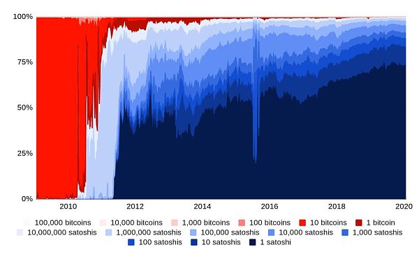 10 BTC層級( 2009 年和 2010 年)—— 應當指出的是,我們的數據包括 coinbase 輸出。在 2009 年和 2010 年,區塊的報酬為 50 ( 10 BTC的倍數),交易量非常低,并且幾乎沒有手續費,因此,很大一部分輸出屬于 10 BTC的倍數類別。從 2011 年起,該數據更加反映非 Coinbase 交易。