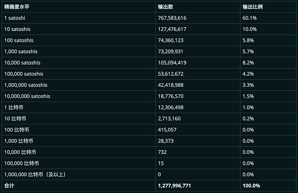 下面的圖 2 總結了主要結果。表格顯示,一般而言,最高精確度的輸出是最常見的,其中 60.1% 的輸出使用了最高可用精確度,而 10.1% 的輸出使用第二高的精確度。在精確度范圍的較低部分中,使用的最低精確度是 100,000 BTC層級,該層級中只有 15 個輸出。區塊鏈上沒有精確度低于 100,000 BTC的輸出。