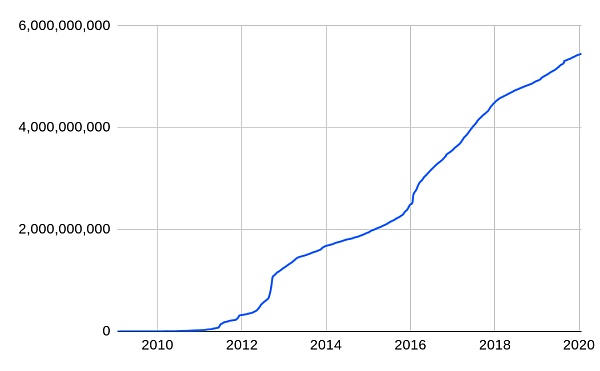 下圖(圖 3 和圖 4 )說明了BTC輸出總數的增長以及其隨著時間的推移如果發展。在BTC的歷史中,已有近 13 億個交易輸出。當然,這些輸出中只有一小部分仍未支出(有時稱為 UTXO )。目前, UTXO 集超過 65,00 萬,占累計總輸出數量的 5.1% 。