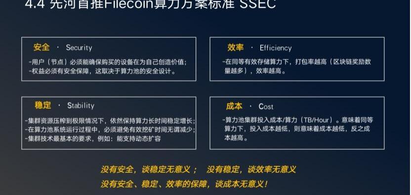 ?第三個是我們提了一個Filecoin算力方案標準SSEC,安全、穩定、效率、成本,你首先要安全,沒有安全談效率沒有意義,沒有穩定談效率也沒有意義,沒有安全、穩定、效率的保證,談成本沒有意義。
