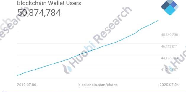 根據blockchain.info數據計算,截止2020年7月5日,blockchain錢包用戶總數達50874784個,環比上周上漲0.54%。