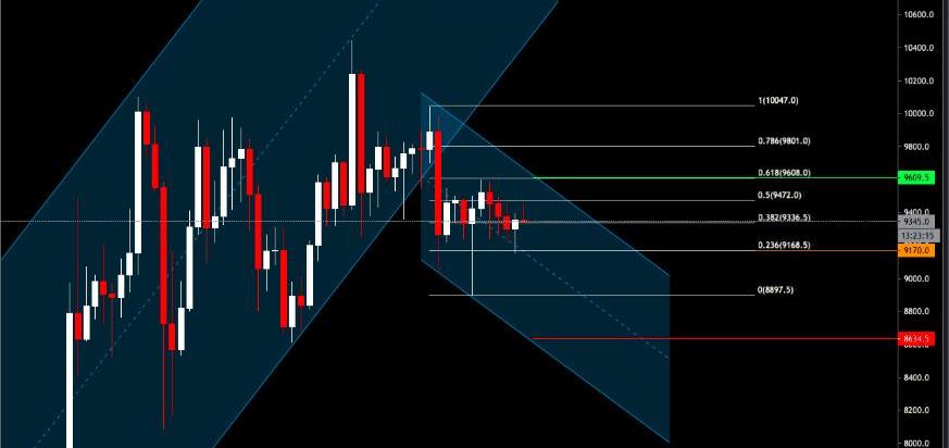 通道上部顯示阻力位在9600美元左右,恰好位于0.618上,通道中點顯示支撐位在0.236斐波那契水平,即9168美元。換句話說,近期比特幣價格壓力位是9600美元,支撐位是9168美元。??
