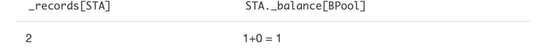 接下來是最有趣的一部分,攻擊者調用gulp()不斷重置_records,使得BPool中始終保持0.000000000000000001個STA。因此攻擊者可以用極高價的0.000000000000000001個STA將流通池中的WETH、SNX、LINK等其他資產消耗光。