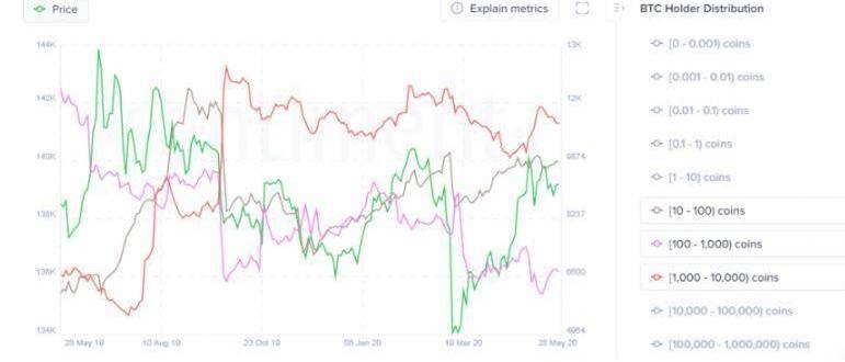 相比之下,從下圖可以看出,擁有較多比特幣的持有者相對保守。不過,在今年四月份之后,擁有比特幣數量在1千至1萬的持有者小幅增加。