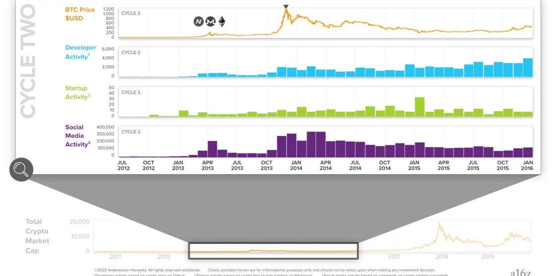 第二個周期在2013年達到頂峰。這個周期可能是大多數科技行業以外的人第一次聽說比特幣的時期。在這個周期中,大約有比上一個周期多10倍的開發者和初創企業數量進入這一領域。
