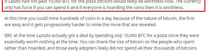 在raddit上搜索“LaszloHanyecz”,最熱帖出現在r/todayilearned版塊下,在這個板塊下關于“?Nowthebitcoinshaveavalueof$6,5million”的討論中,有用戶認為“IfLaszlohadnotpaid10,000BTCforthepizzabitcoinswouldlikelybeworthlessnow.Thecurrencyonlyhasforceifyoucanspenditandifeveryoneishoardingthecoinsthenitisworthless.”
