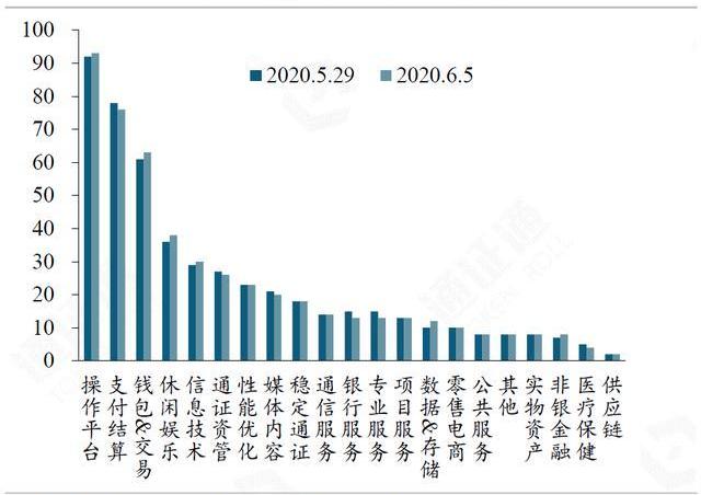 本周通證數量增長較為明顯的BICS二級行業為數據&存儲和錢包&交易,下降較為明顯的為銀行服務和專業服務。