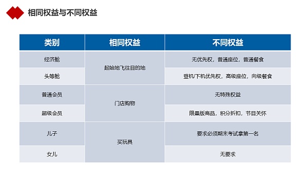 例如當我們乘坐飛機的時候,「頭等航」的旅客總是擁有比「經濟艙」的旅客優先登機、優先下機的權利,擁有更大更舒適的座位,以及更可口美味的空中餐食;