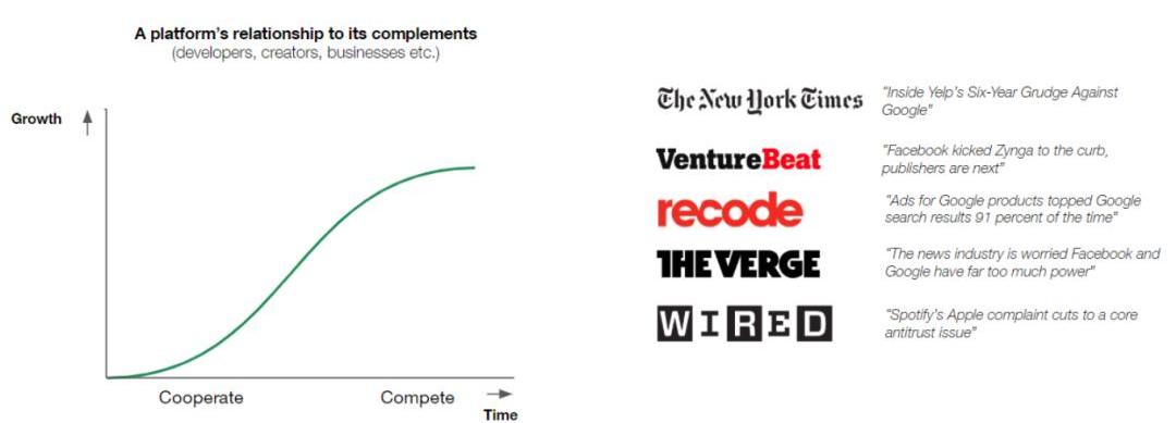 ·??平臺天然傾向于扼殺創新。對于第三方角度來看,從合作到競爭的過渡使得雙方很難維持可持續的業務伙伴關系。這種平臺風險的典型例子諸如Spotify與Apple的交惡,其中Apple被指控在AppStore中不公平地推廣自己的音樂服務。